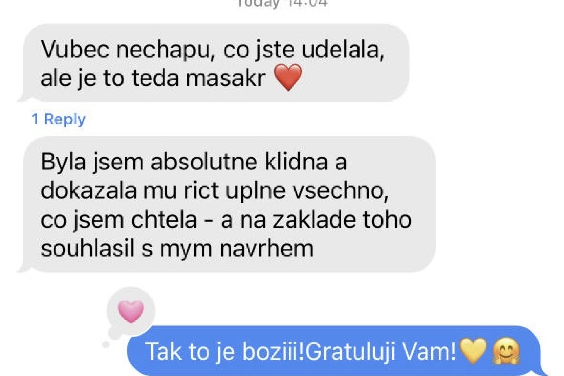 3. březen 2024Chcem zo srdca odporučiť Terezku;)je vo svojej práci profesionálna empatická vie sa vcítiť do klijenta a veľmi rýchlo ti pomôže vyriešiť čo ťa trápny.nie na povrchu ale do HLBKY....po čistení mám pokojnú myseľ zmyzlo vnútorné napätie môžem kľudne spávať som pokojnejšia. je to najlepšia investícia v mojom ZIVOTE